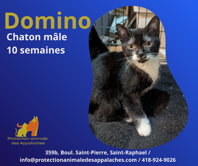 Domino est un adorable petit chaton mâle d’environ 10 semaines. Sociable et affectueux, il aime la compagnie des autres chats et raffole des câlins. Curieux de nature, il explore son environnement avec enthousiasme et intérêt.