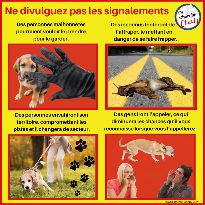 Première étape : informez rapidement la Protection Animale des Appalaches afin que nous puissions vous accompagner dans les démarches. Deuxième étape : contactez GE Cherche Charly, des spécialistes de la recherche de chiens en fuite. Leur expertise et leurs méthodes de recherche peuvent grandement aider à retrouver votre compagnon.